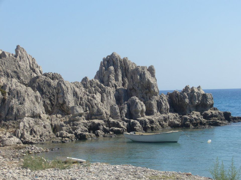 Although short, this is a good afternoons walk along the beach around the bay between the two villages of Haraki and Kalathos. Once out of Haraki the beach becomes deserted of people with the barren land dotted with olive trees on one side and the deep blue sea on the other. The beach is shingle and can become heavy going but for some of the distance there is a dirt track just beyond the beach which makes for easier walking. Take it easy, with stops to dip ones feet in the sea and this makes a relaxing introduction to Rhodes walking.