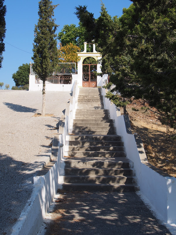 Leave the village square heading towards Kiotari, with Memories bar on the left and the supermarket on the right. Take the first turning on the right and follow the road through to the end passing the old derelict building. Turn right at the junction and follow the road around to the left. Keep to the road which soon bears round to the left passing the pole in the middle of the road. Take the first turn on the right. Follow the road out of the village ignoring all turns. The asphalt track leads through smallholdings and olive groves until it junctions with another track on the right, opposite a work unit on the left. The track on the left is the next direction, but first continue a few yards ahead where the steps to St Seraphin church are on the right.
