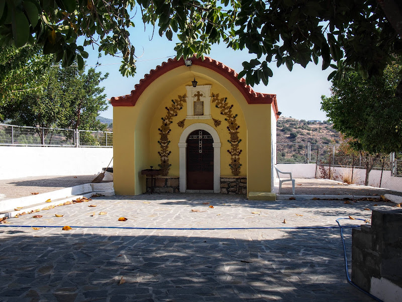 An asphalt road leads the way out through the olive groves and small holdings that surround the northern side of Lardos. This area is a wide flat valley through which the Fonias Stream meanders. During most of the year it is no more than a wide dry river bed but in winter so much water pours down here from the hills and mountains around Laerma that occasionally it floods Lardos. Unbelievable during the arid months of summer and early autumn. This route follows the course of the river for half a kilometer to where there is a junction of tracks and on the right is the Church of St Seraphin Άγιος Σεραφείμ